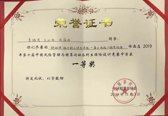 本科生保险产品设计竞赛中,陈华老师指导的李瑞贤、王沁雨和肖淦丹三位本科生的作品《视力矫正综合保险——基于保险+服务视角》本科生保险产品设计竞赛获得了中国精算师协会颁发的一等奖。