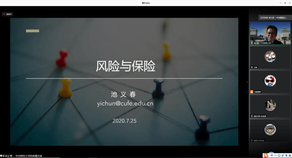 随后,副院长池义春教授做了题为《风险与保险》的学术报告。池义春教授一方面对风险与保险的特点进行专业分析,另一方面从微观角度对风险比较研究、Arrow模型等进行了清晰透彻的剖析,展示了保险理论研究的深度,使同学们对风险管理与保险相关的基础理论有了进一步的理解,也让同学们对保险专业知识所需的基本素养有了更深的认识。