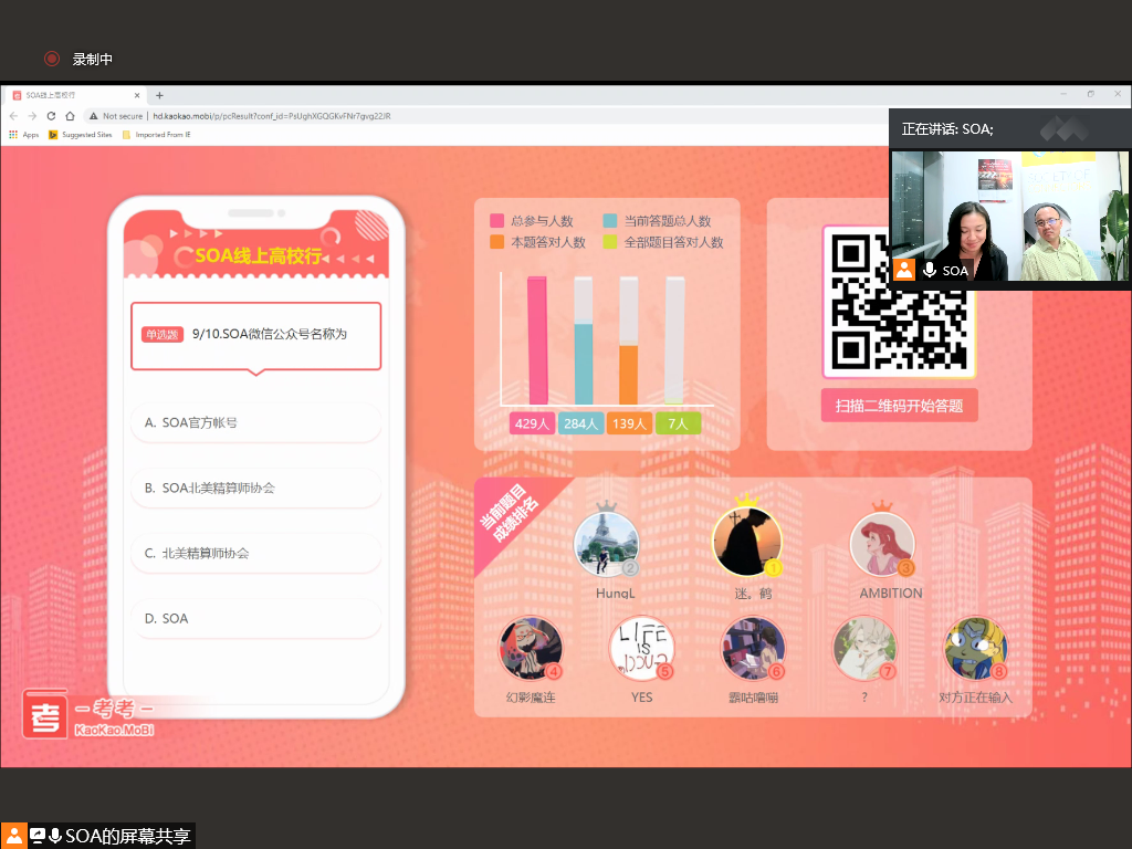 在最后的有奖问答中,我院同学们积极参与,认真作答。根据综合正确率与答题速度进行排名,我院2020级精算学研究生王明红同学在400多人中脱颖而出,斩获第一名。