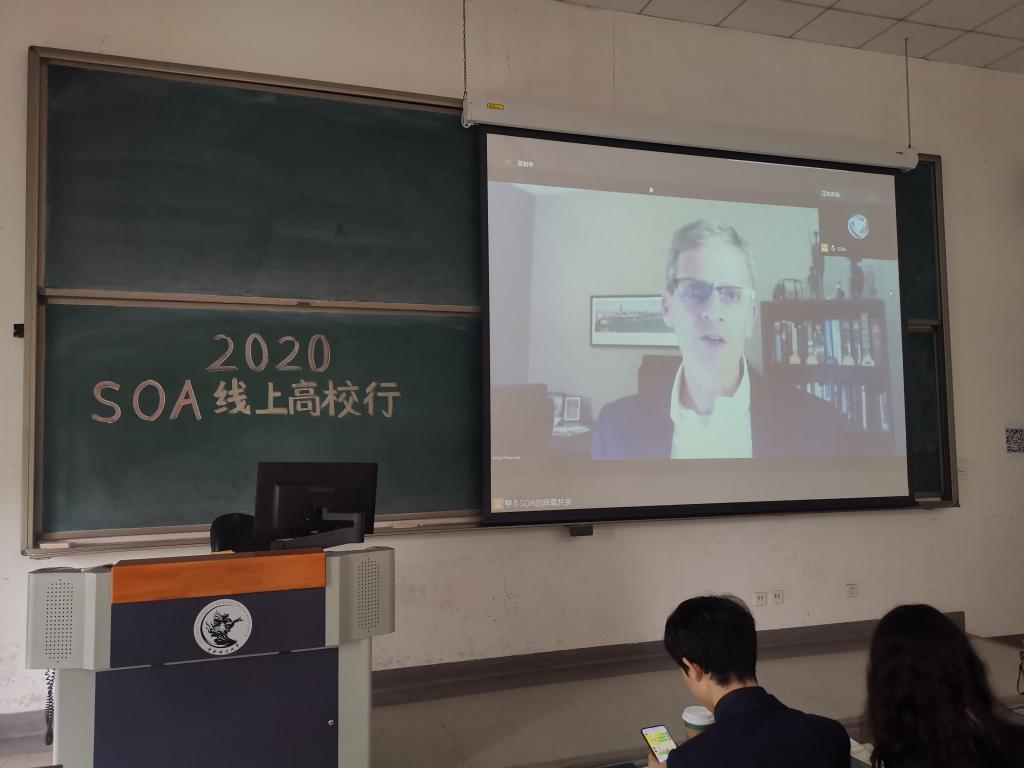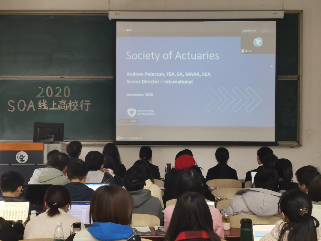 2020年11月14日下午,“SOA线上高校行”活动在线上举行,我校在内的26所院校以集体形式与会。我院组织师生在沙河校区主教学楼212教室同步观看讲座。本次在线讲座主讲人为北美精算师协会(Society of Actuaries, SOA)的国际部高级总监AndrewPeterson先生和中信保诚人寿保险有限公司副总经理崔巍先生,主持人为SOA中国区首席代表李晶鑫女士,我院副院长池义春教授出席了此次讲座。