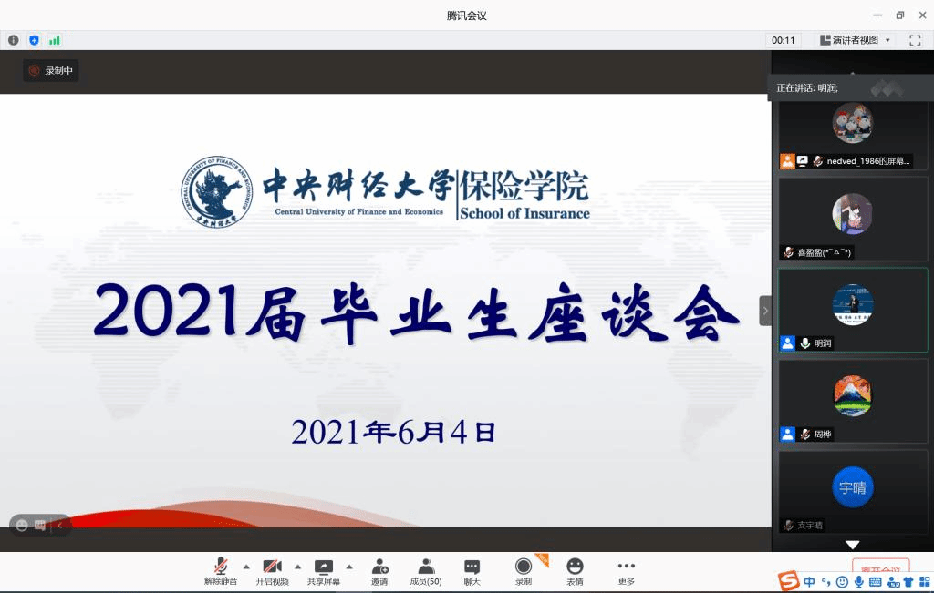 5月20日下午,学院在沙河校区西区主教403举办了研究生就业经验座谈分享会,邀请了7位2021届学长学姐为2020级学弟学妹们分享了求职与就业经验。5月30日上午,由3044永利集团2018级、2019级和2020级精算学研究生共同举办的研究生毕业生就业经验交流座谈会,通过腾讯会议的方式在线上进行。本次会议邀请到6位优秀的应届毕业生,分享了他们在暑期实习、秋招春招、学术科研等方面的经验。两次座谈会涵盖直保、再保、咨询、资管等多类公司的求职经验分享,满足了们多样丰富的需求,为大家未来求职道路指引了方向,也更加坚定了毕业生们矢志不渝、立志报国的信念!