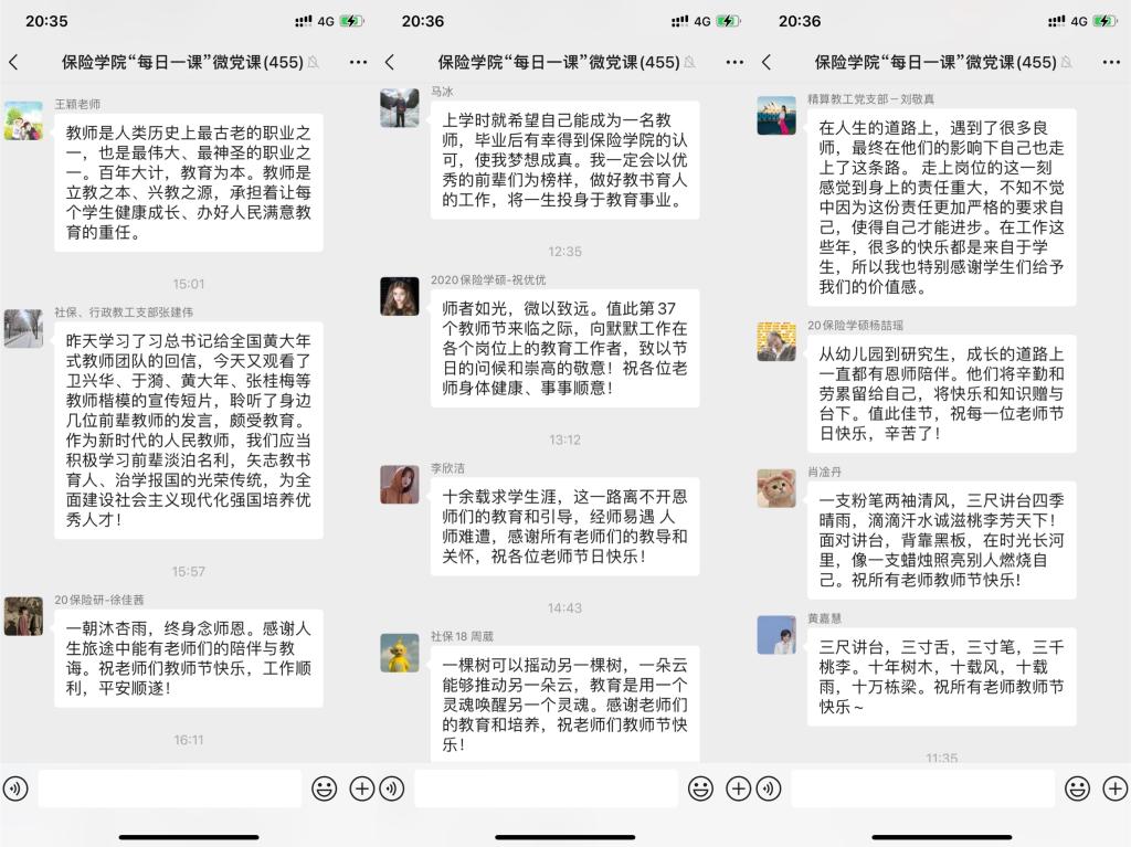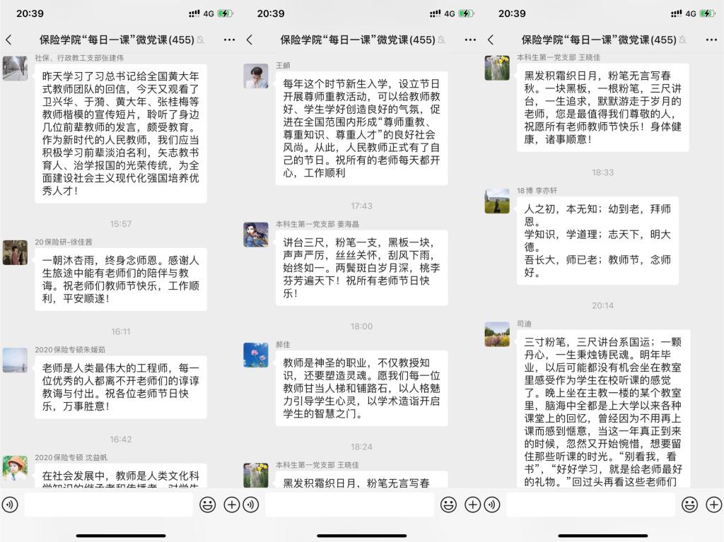 学生党员纷纷发表感想和祝福。2019级精算学研究生陈焕龙谈到,“三寸粉笔,三尺讲台系国运;一颗丹心,一生秉烛铸民魂。”这是习近平总书记对教师的高度评价。感恩各位老师对教育事业的奉献,感恩老师们对每一位学子的教诲,祝老师们节日快乐!2020级精算学研究生黄嘉慧祝福,三尺讲台,三寸舌,三寸笔,三千桃李。十年树木,十载风,十载雨,十万栋梁,祝所有老师教师节快乐!本科生第一党支部周葳表示,一棵树可以摇动另一棵树,一朵云能够推动另一朵云,教育是用一个灵魂唤醒另一个灵魂。感谢老师们的教育和培养,祝老师们教师节快乐!