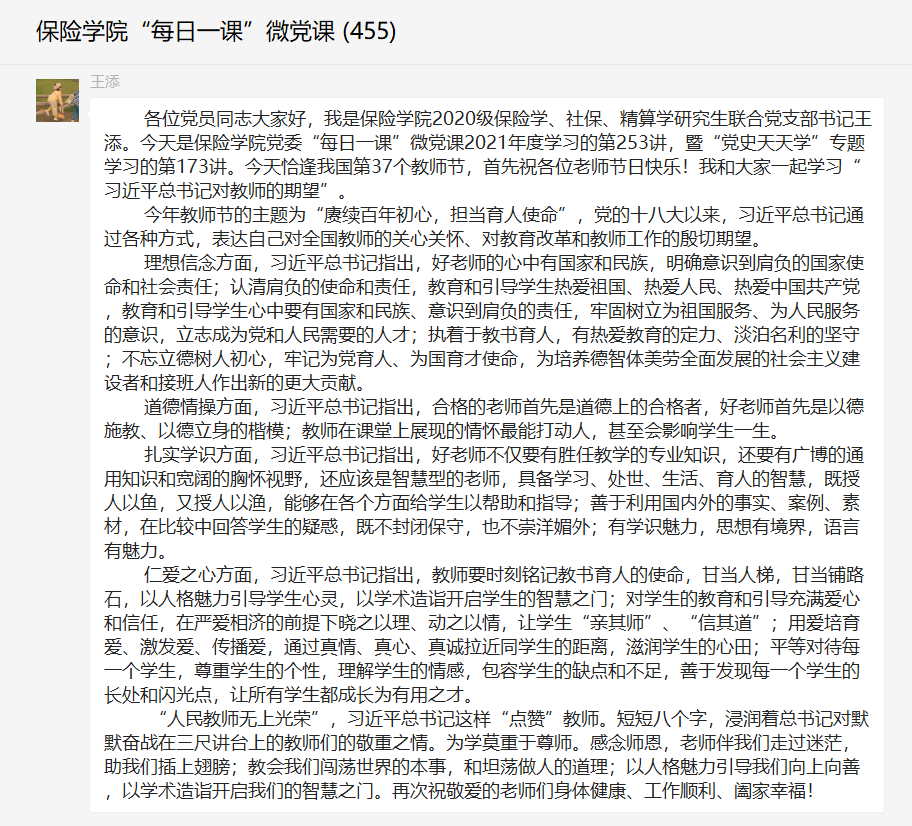 教师节当日,学院“每日一课”微党课设置了“教师节专栏”,由2020级保险学、社保、精算学研究生联合党支部书记王添带来《学习“习近平总书记对教师的期望”》微党课。她提到,为学莫重于尊师。感念师恩,老师伴我们走过迷茫,助我们插上翅膀;教会我们闯荡世界的本事,和坦荡做人的道理;以人格魅力引导我们向上向善,以学术造诣开启我们的智慧之门。祝敬爱的老师们身体健康、工作顺利、阖家幸福!