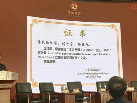 陈华教授、刘子宁助理教授和2021级保险专硕研究生杨晓旭报告的论文获得了本届北大赛塞论坛的优秀论文奖
