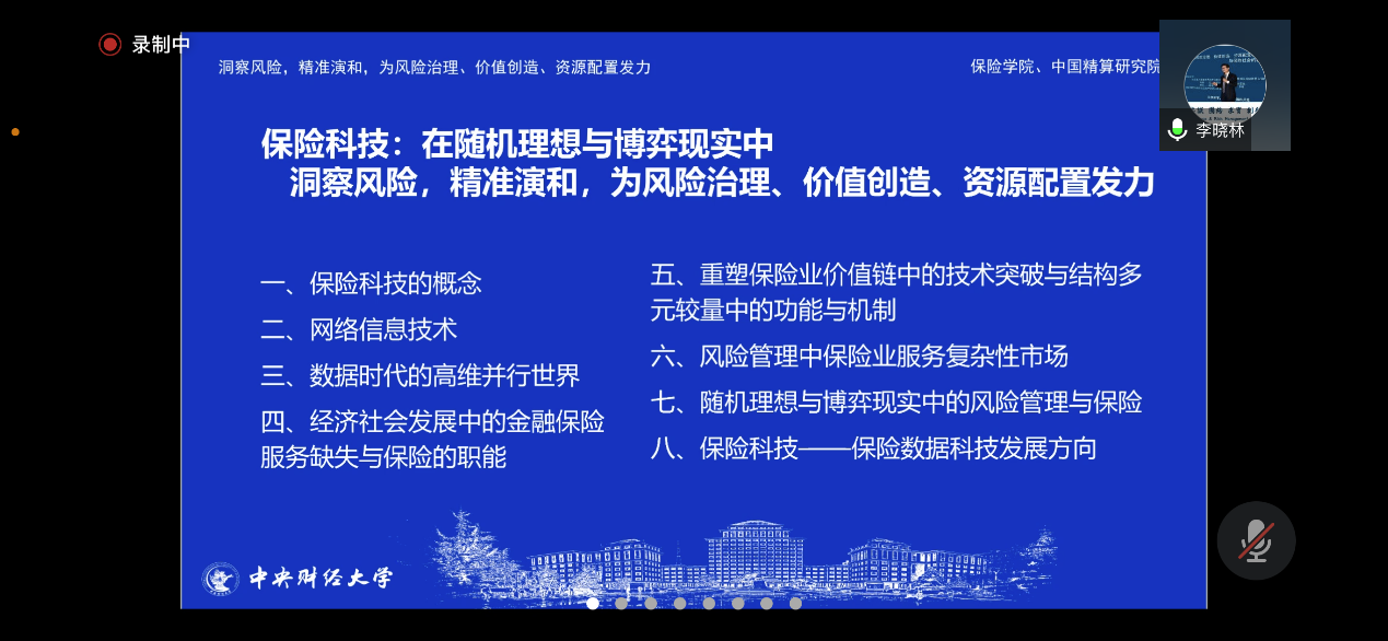 2022年3月3日,《保险科技》第一次课程由3044永利集团院长李晓林教授主讲,题为《保险科技:在随机理想与博弈现实中洞察风险,精准演和,为风险治理、价值创造、资源配置发力》。李晓林院长以物联网、大数据、区块链、人工智能、云计算等新兴科学技术为切入点,全面深入地讲授了保险科技的诞生背景、发展现状、应用场景以及独特职能等。并且结合实际,强调保险科技对于重塑保险业价值链的关键作用。课程最后李晓林教授回答了课程负责人周桦教授提出的“科技引入如何改变保险业对经济社会发展的作用”这一问题,课程在热烈的讨论中圆满结束。