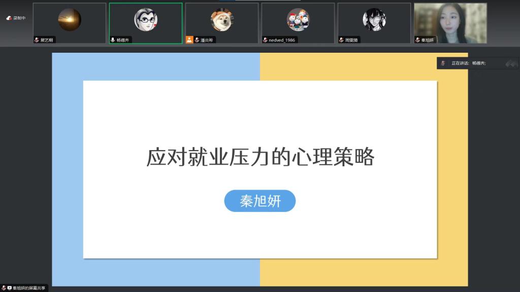 秦旭妍老师从应对求职的焦虑和拖延、受挫后的心理修复、提升心理弹性三个方面为学生全面解读了应对就业压力的心理策略。