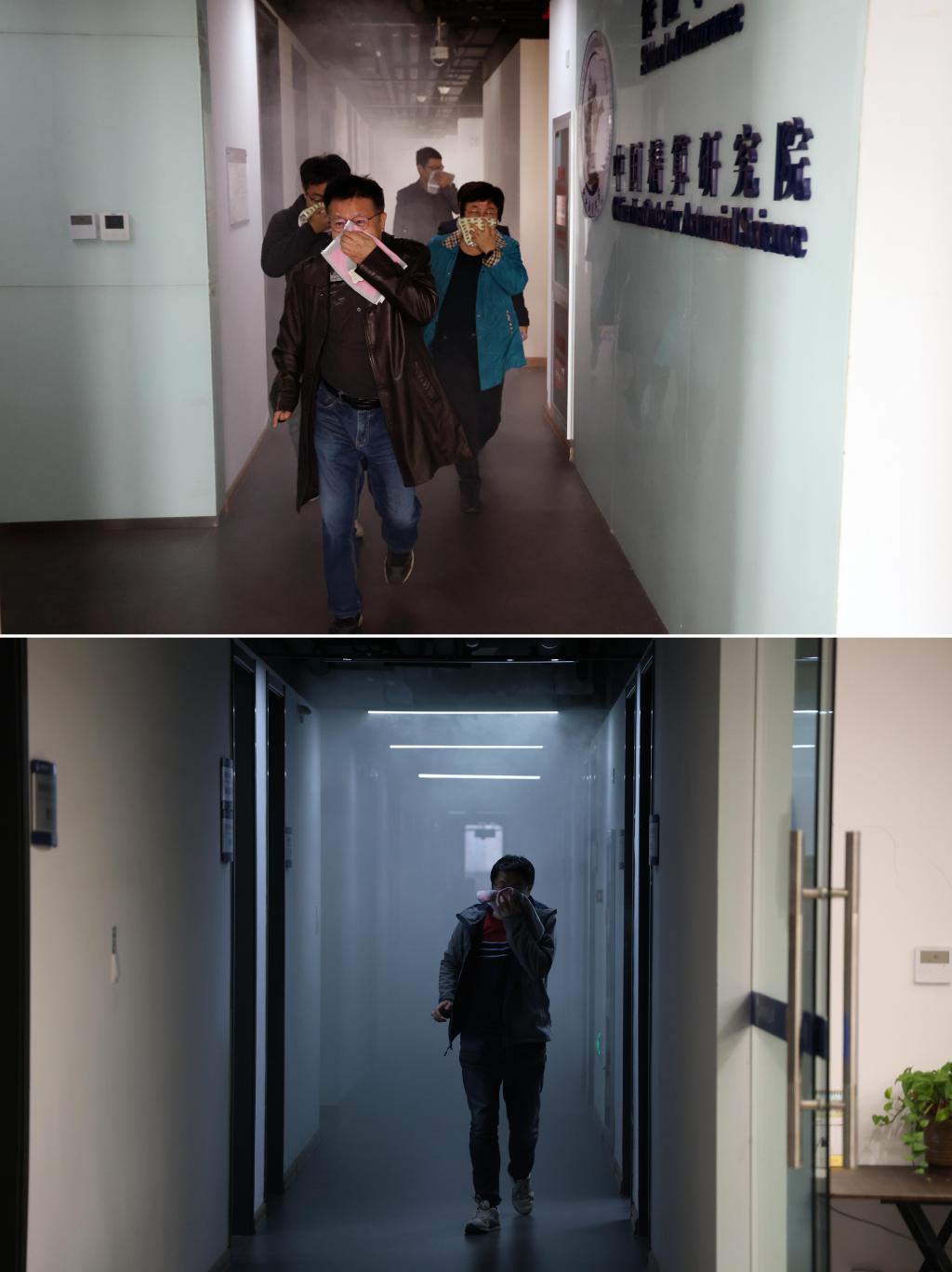 演习开始,办公区内弥漫着浓烟。火警警报一响起,老师们立即停止一切活动,进入应急状态,用湿毛巾捂住口鼻,附身低姿快速沿安全通道往下撤离至楼下安全地带。