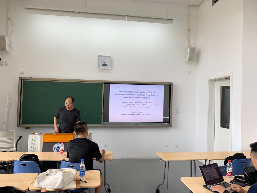 首先,祝伟老师做了题为“Procrastinated Participation in Social Insurance Expansion: Evidence from China’s New Rural Pension Scheme”的报告。中国新农村养老金计划(NRPS)目前已经几乎覆盖到所有的农民。通过观察该项目的长期动态参与情况,他发现尽管NRPS得到了中国政府的大额补贴和大力推动,但仍有很大一部分农民拖延参与。利用NRPS福利结构中60岁年龄的不连续性,他们考察了NRPS政策设计对参与行为的影响,发现现金转移提供了强有力的参与激励。政府晋升的村内和村外渠道与拖延行为有关,这二者有时会产生抵消效应。这些发现揭露了拖延参与NRPS的行为本质,体现了家长式政策设计和推广的重要性,同时提醒人们家长式政策可能产生的副作用,即在强大政府的密集说服中会出现效率损失。
