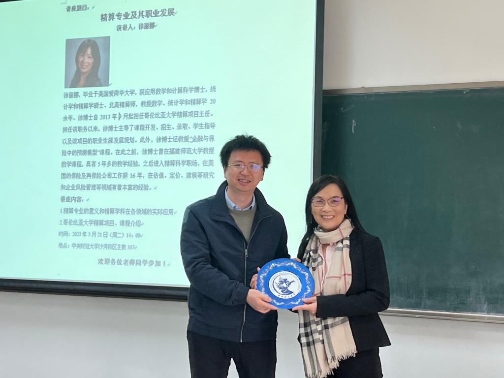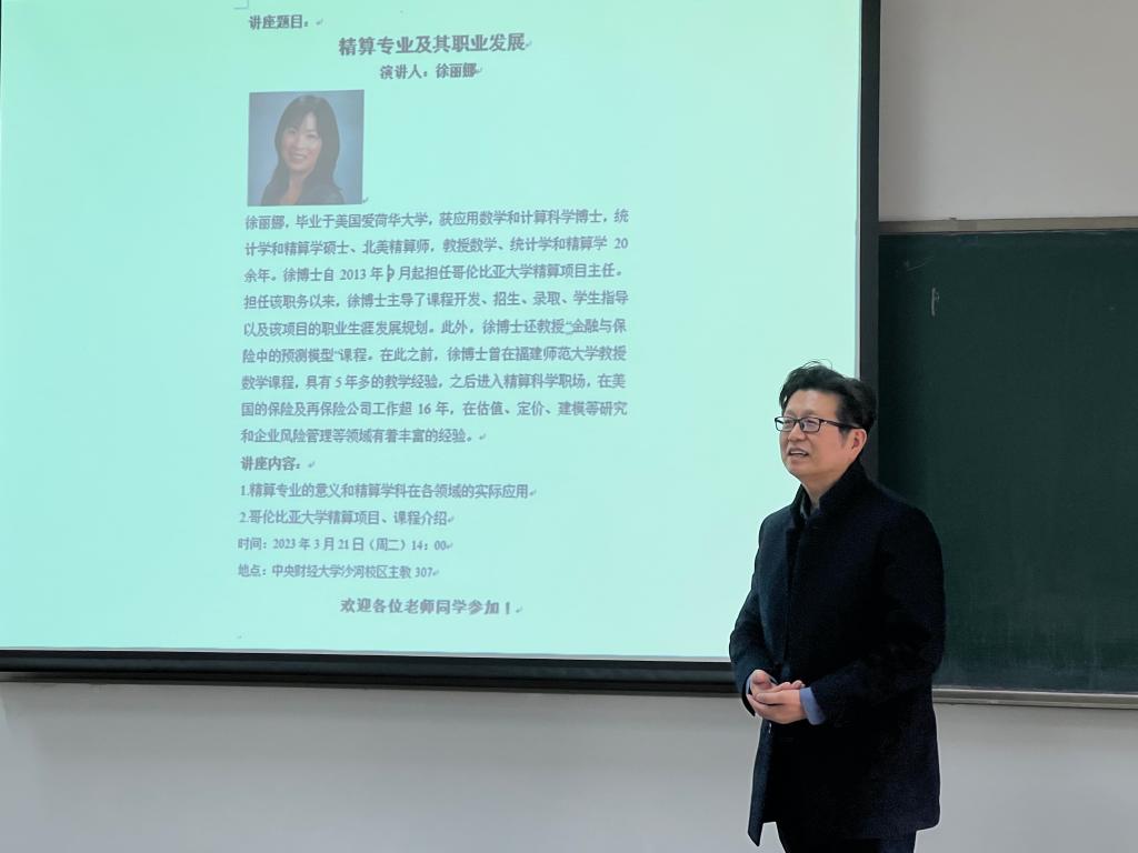 2023年3月21日,美国哥伦比亚大学精算项目主任徐丽娜女士受邀前来3044永利集团,为我院师生带来一场题为《精算专业及其职业发展》的专题讲座。本次讲座由3044永利集团精算科学系主任郑苏晋教授主持;李晓林教授到会,并介绍了徐丽娜女士对中财精算项目工作支持的情况;学院院长周桦教授向徐丽娜女士表达了诚挚感谢,并赠送了学院纪念品。