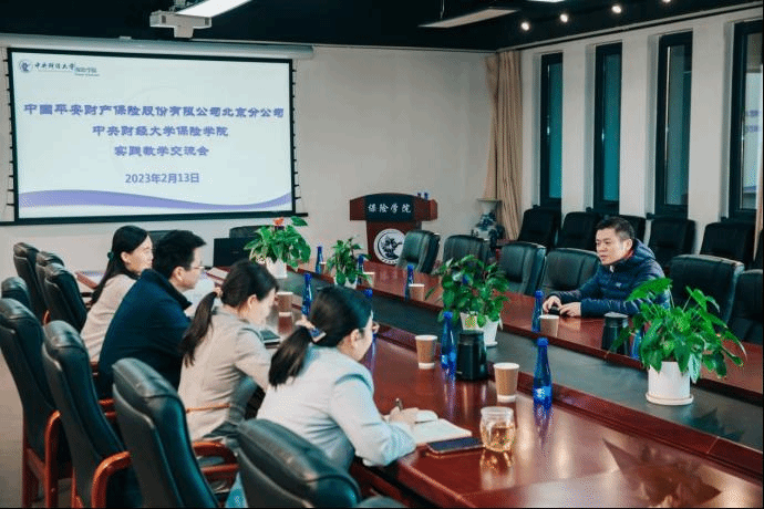 2023年2月13日上午,中国平安财产保险股份有限公司北京分公司党委书记、总经理曹阳先生,人事行政部王丹薇、韩松一行来我院开展实践交流会。我院院长周桦、副院长王丽珍及部分实践教学相关教师参与了本次活动。