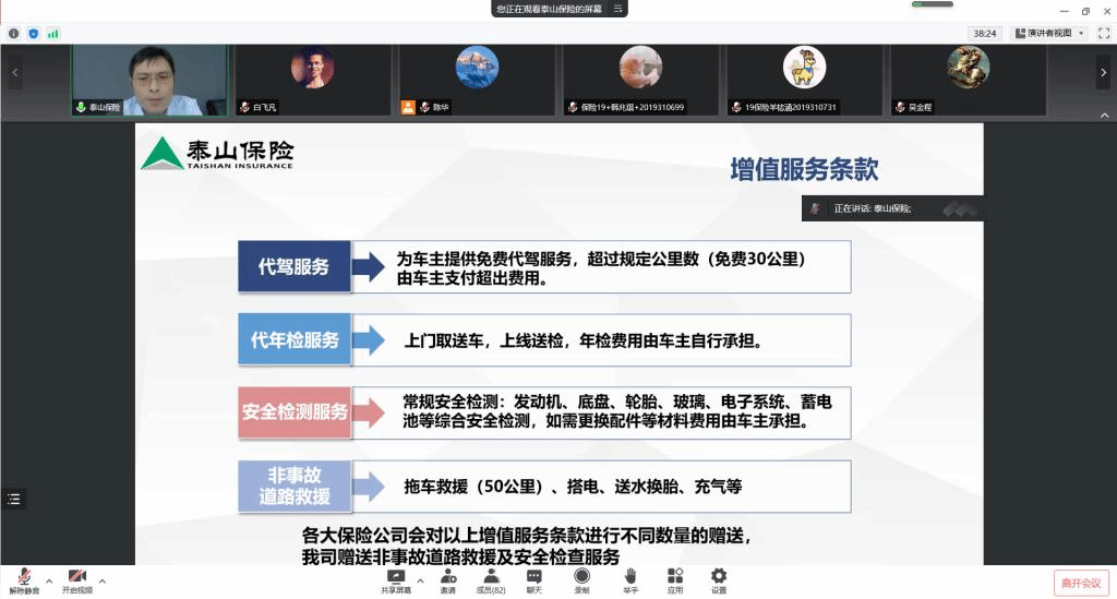 紧接着侯先生介绍了车险的增值服务条款,其包括代驾服务、代年检服务、安全检测服务、非事故道路救援服务等。随着车险业务的不断发展,其增值业务必然愈加成熟。