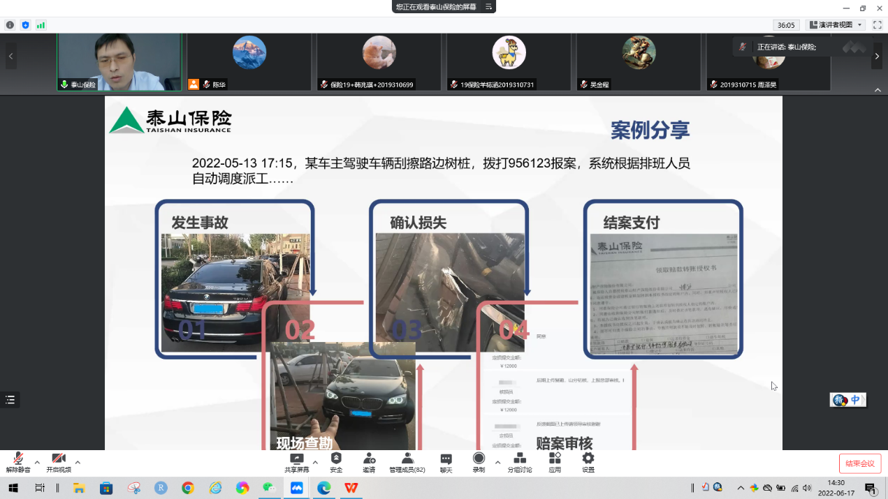 接下来侯先生向同学们分享了一个理赔案例。2022年5月13日下午17:15许,某车主驾驶车辆刮擦路边树桩,拨打热线956123报案后,系统根据排班人员自动调度员工进行了现场查查勘、确认损失、赔案审核、结案支付等流程,最终快速、顺利、出色地完成理赔流程。