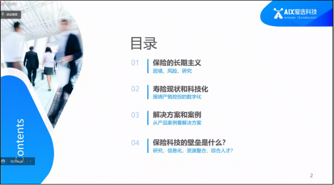 何剑钢先生以保险业的百年之大变局为开端,阐明如今行业所面临的发展困境。在此情境下,为实现保险的长期主义,众多企业纷纷探索破局之路,布局科技产业、实现科技赋能成为企业转型的关键突破口。积极运用保险科技,能够帮助企业在产品生产、销售、投资、风控等方面更好地实现数字化。何剑钢先生重点强调了科技赋能产品精算的重要性——通过搭建智能云定价平台等方式重新变革数据、模型等流程,进行更高效率的精算分析。在此基础上,何总以爱选科技的产品为例,介绍公司将科技融入保险产品的全新解决方案,如智能精算和核保系统、健康管理和服务平台“苞米新生活”等,用保险科技为产品创造出更多的附加价值。不过,何总也指出目前保险科技在理论研究、信息化等板块仍存在一定的发展壁垒,需要企业进行更加深入的探索与尝试。