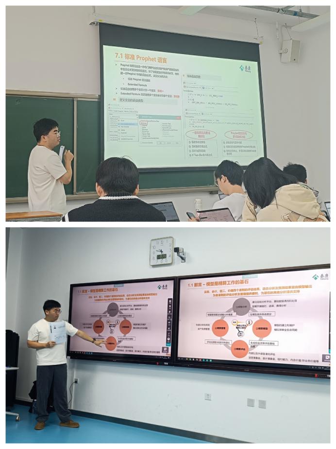 为期两天的课程各有侧重,层层深入。10月18日,泰康人寿精算部模型管理高级精算经理周涛先生应邀开展系统性教学。他从Prophet软件的行业应用场景与重要性开篇,帮助学生建立宏观认知;讲解了软件组件与界面操作技巧,夯实实操基础;深入数据结构、核心代码库与产品架构,揭秘软件应用逻辑;讲解运行设定、结果解读及编程语言规则,全面覆盖模型开发全流程,助力学生建模和精算软件实操技能。