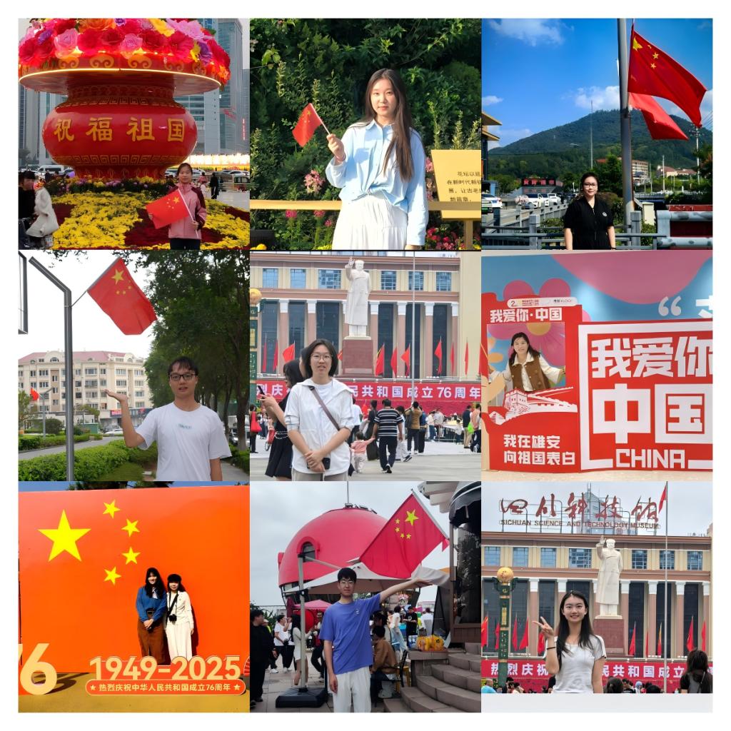 国庆期间,党支部党员利用假期走进城市地标、参加升旗仪式,以“我与祖国共合影”的方式表达对祖国的热爱。有的党员前往天安门广场在“祝福祖国”巨型花篮前驻足留念,有的党员在校园内与国旗合影,记录下与祖国同框的珍贵时刻。一张张洋溢着自豪与喜悦的照片,不仅展现了新时代大学生的精神风貌,更传递出青年党员对祖国繁荣昌盛的美好祝愿。
