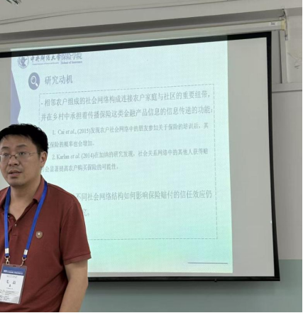 7月11日,毛磊副教授在特邀主题论坛“行为保险学”分论坛上汇报了其研究成果《理赔信任、保险赔付与投保决策》。该研究指出保险赔付可以放松投保人面临的流动性约束从而增加投保(收入效应),也可以通过增加投保人对理赔的信任程度从而增加投保(信任效应)。该研究利用梅州市农户投保农业保险和保险理赔的多期数据分析发现:参保农户获得保险赔付会显著提高农户对下一期保险的投保率;由于保险赔付的信任效应,其他临近农户获得保险赔付也会提高农户对于下一期保险的投保率;乡村社会网络作为信息传播的关键渠道,显著强化了保险赔付的信任效应。